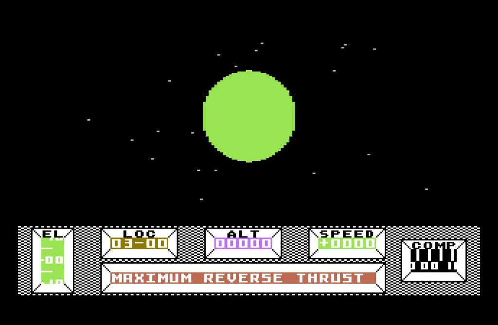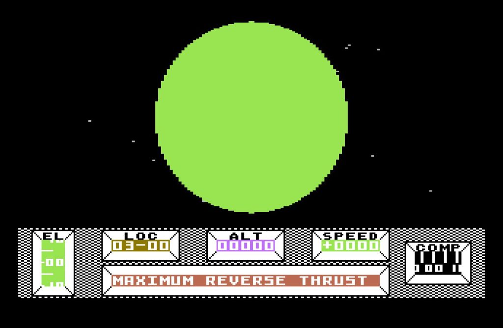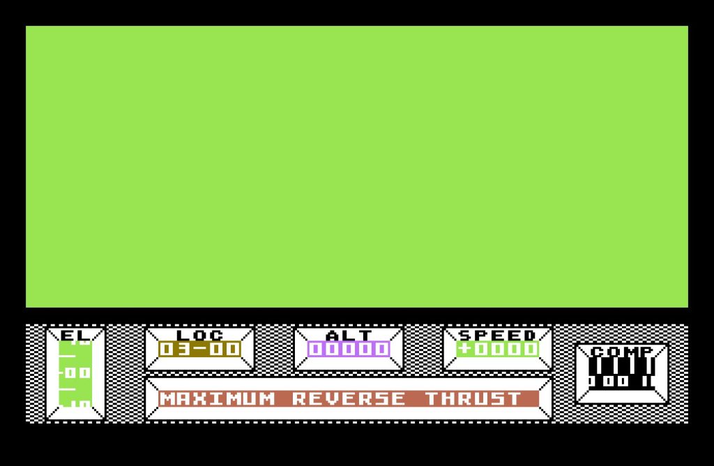 This intro sets the scene brilliantly. In 1985, cutscenes were a rarity, yet Mercenary opens with a scripted sequence that pulls you in. Benson soon informs you that the ship’s guidance system is failing, and you’re on a collision course with the planet Targ. As the Novadrive disengages and Benson attempts to activate reverse thrusters, the planet looms ever larger. The green landscape fills your screen, a sprawling road network rushes toward you—until CRASH!