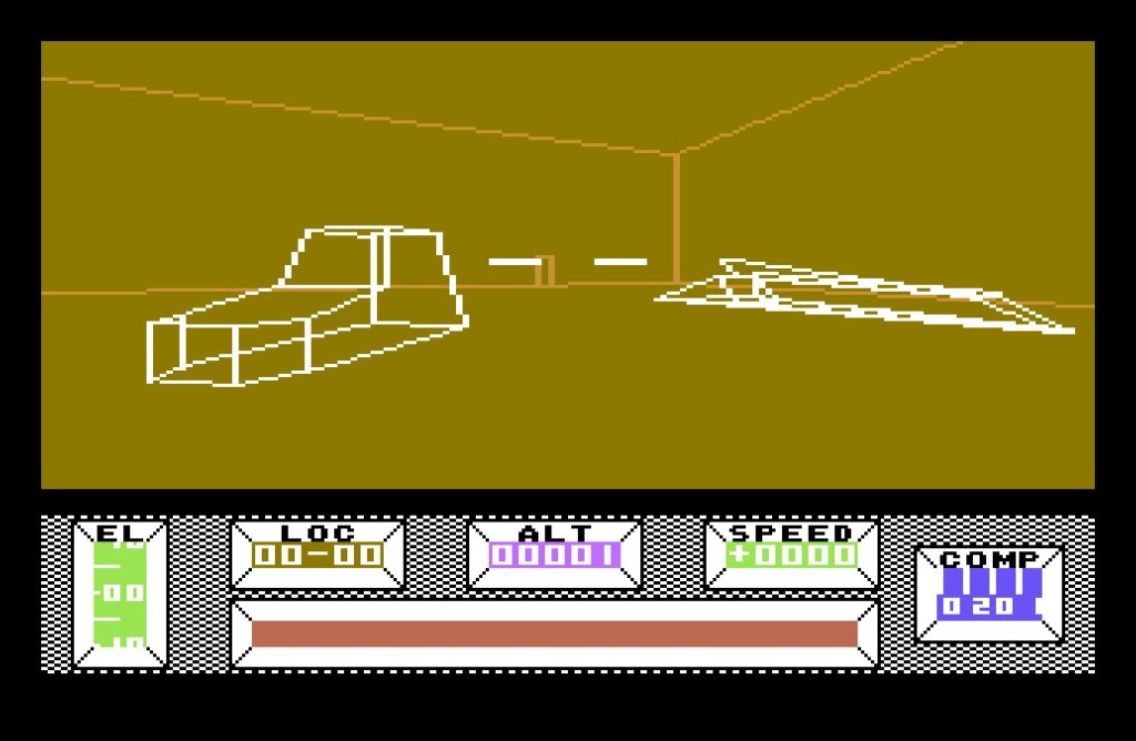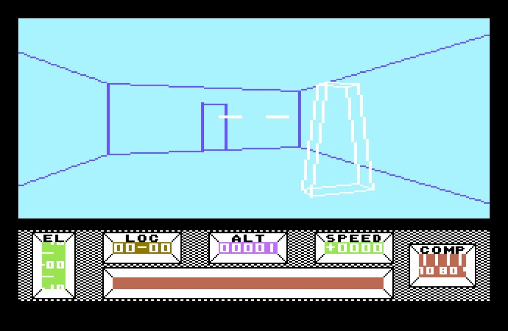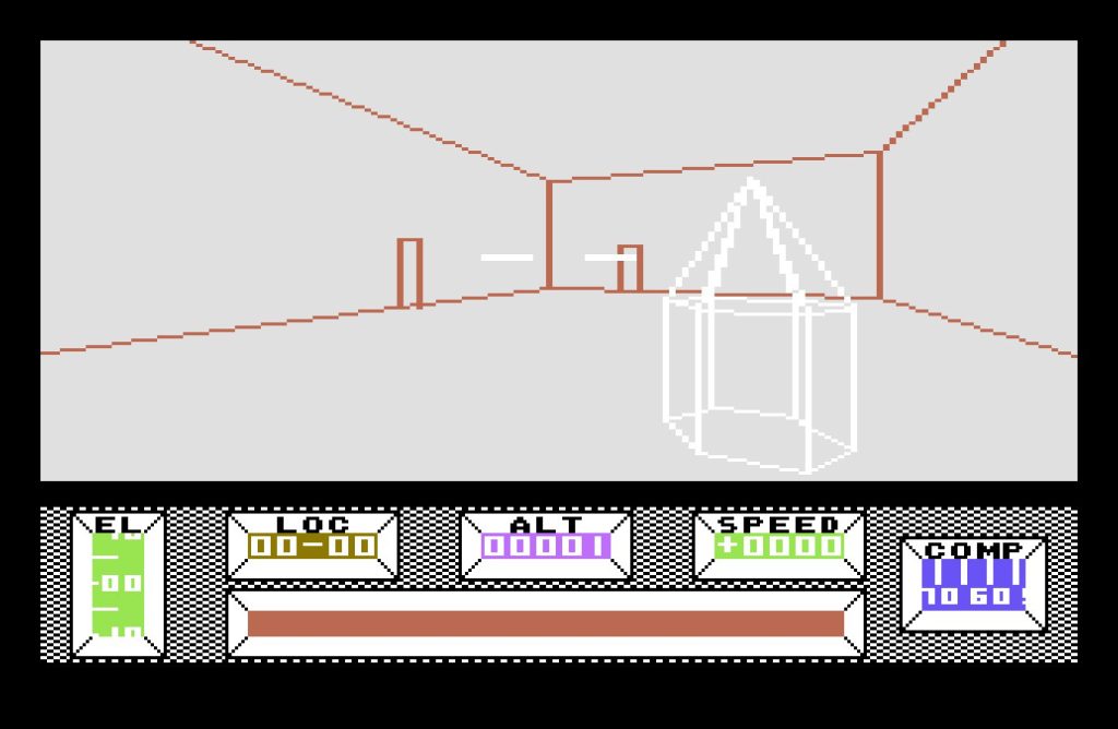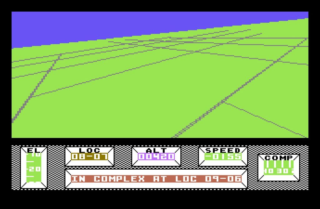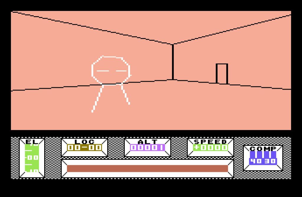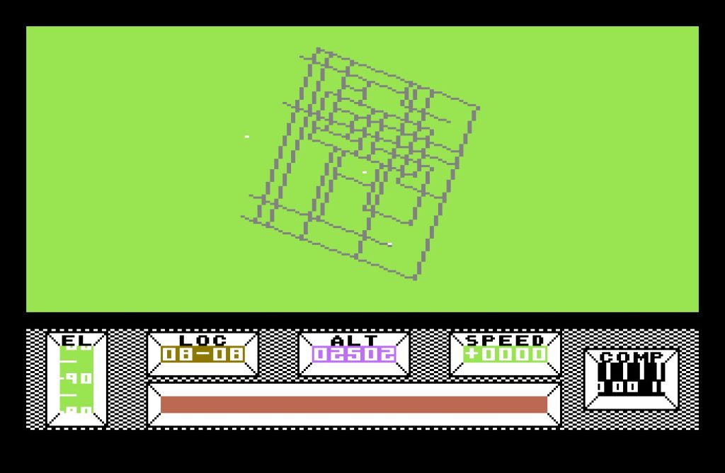 The bulk of the game takes place in Central City, a vast, deserted metropolis built on a 16×16 grid. Each location is marked with a grid reference, displayed at the bottom of the screen, along with a compass—an essential tool, as it’s easy to lose your bearings. The crash site, at location 08-08, serves as your starting point, but you’re free to roam. Various structures from bridges, monuments, a stadium, and even a pub amongst many others dot the cityscape. Though rendered in wireframe vectors, the architecture is striking, especially for an 8-bit game.