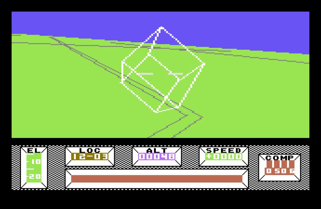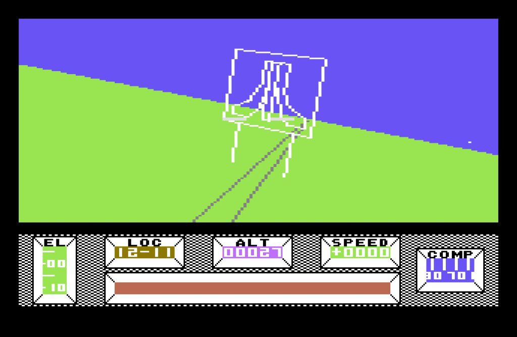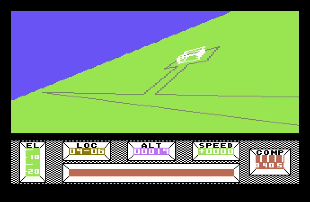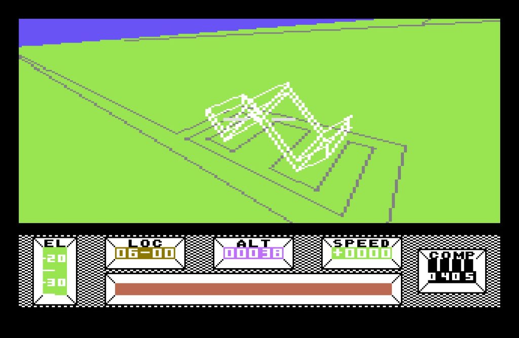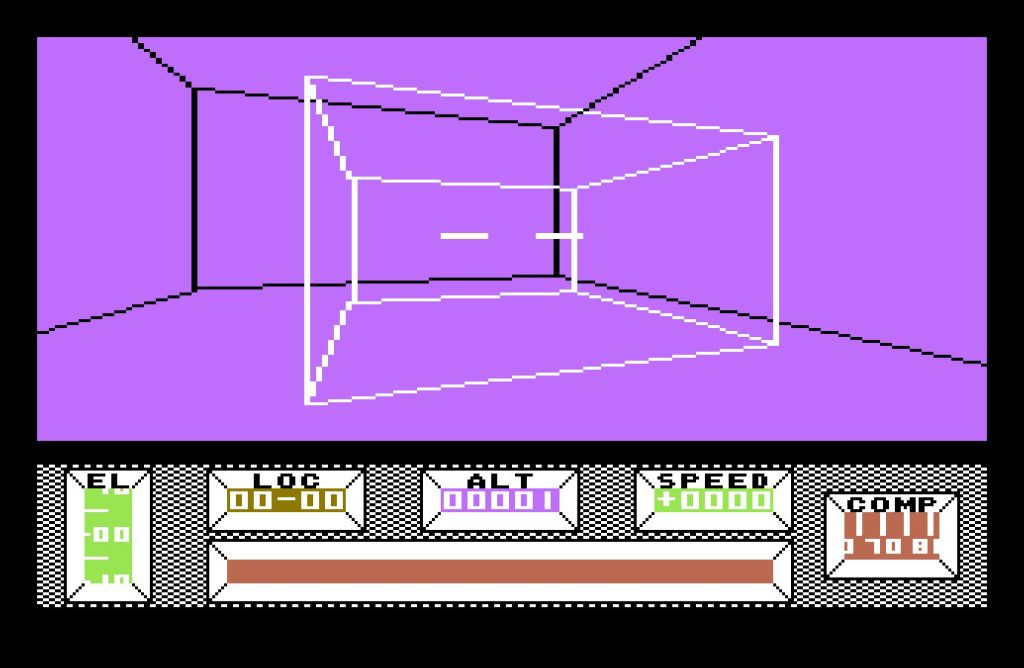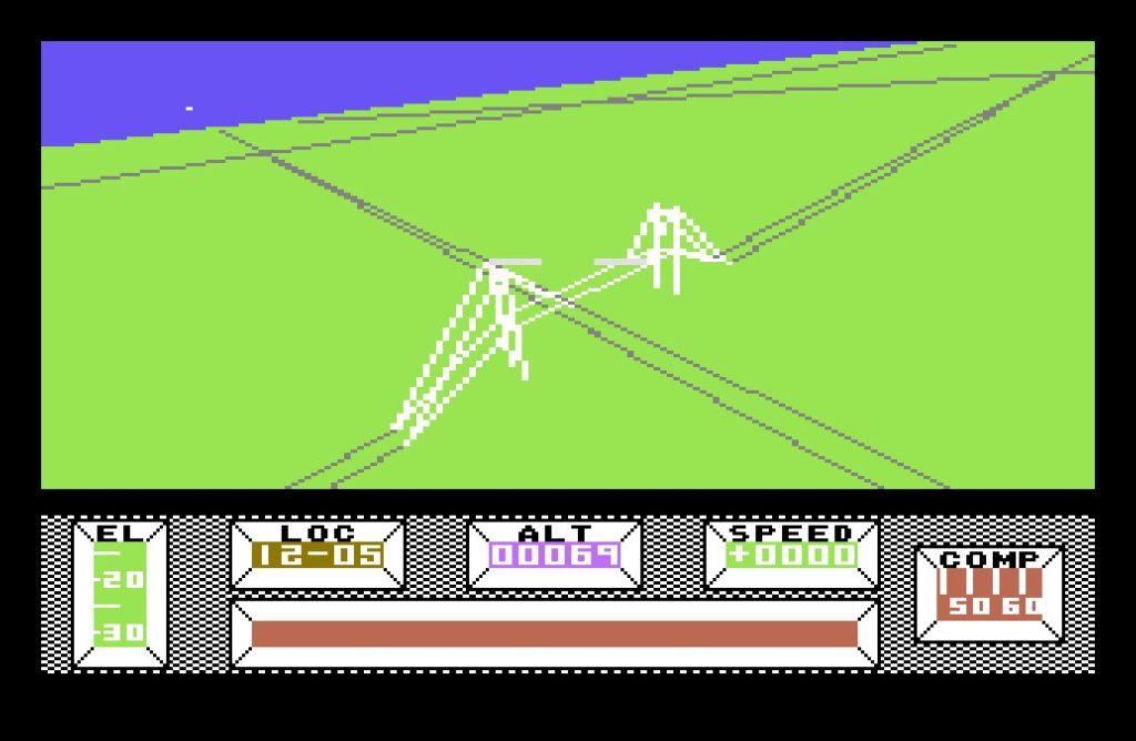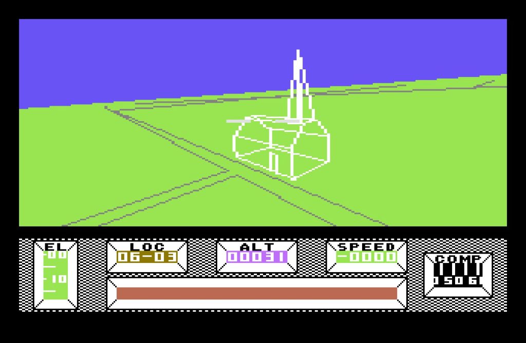 The bulk of the game takes place in Central City, a vast, deserted metropolis built on a 16×16 grid. Each location is marked with a grid reference, displayed at the bottom of the screen, along with a compass—an essential tool, as it’s easy to lose your bearings. The crash site, at location 08-08, serves as your starting point, but you’re free to roam. Various structures from bridges, monuments, a stadium, and even a pub amongst many others dot the cityscape. Though rendered in wireframe vectors, the architecture is striking, especially for an 8-bit game.