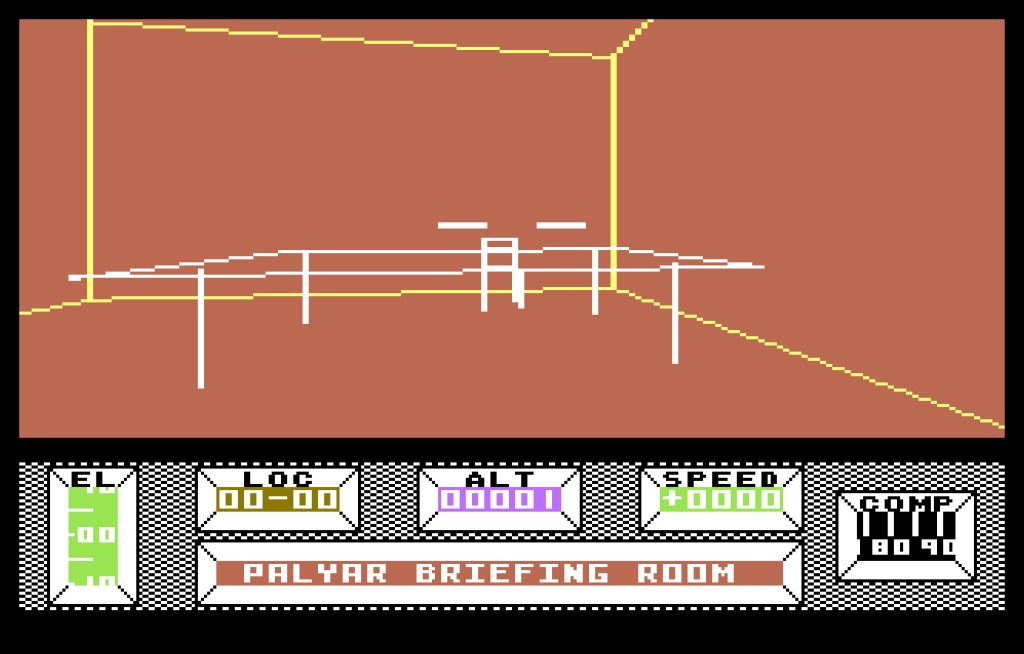 From this point on, you’re in control. Your ship has crash-landed in Central City, and the game unfolds from a first-person perspective. You can turn, move forward and backward, and explore in full 3D—a rare level of freedom for the time. Conveniently, you’ve crashed near an airfield where a ship awaits on the landing pad. Benson informs you that it’s for sale. You now face your first real choice: buy the ship for 5,000 credits or steal it. But be warned—stealing has consequences.